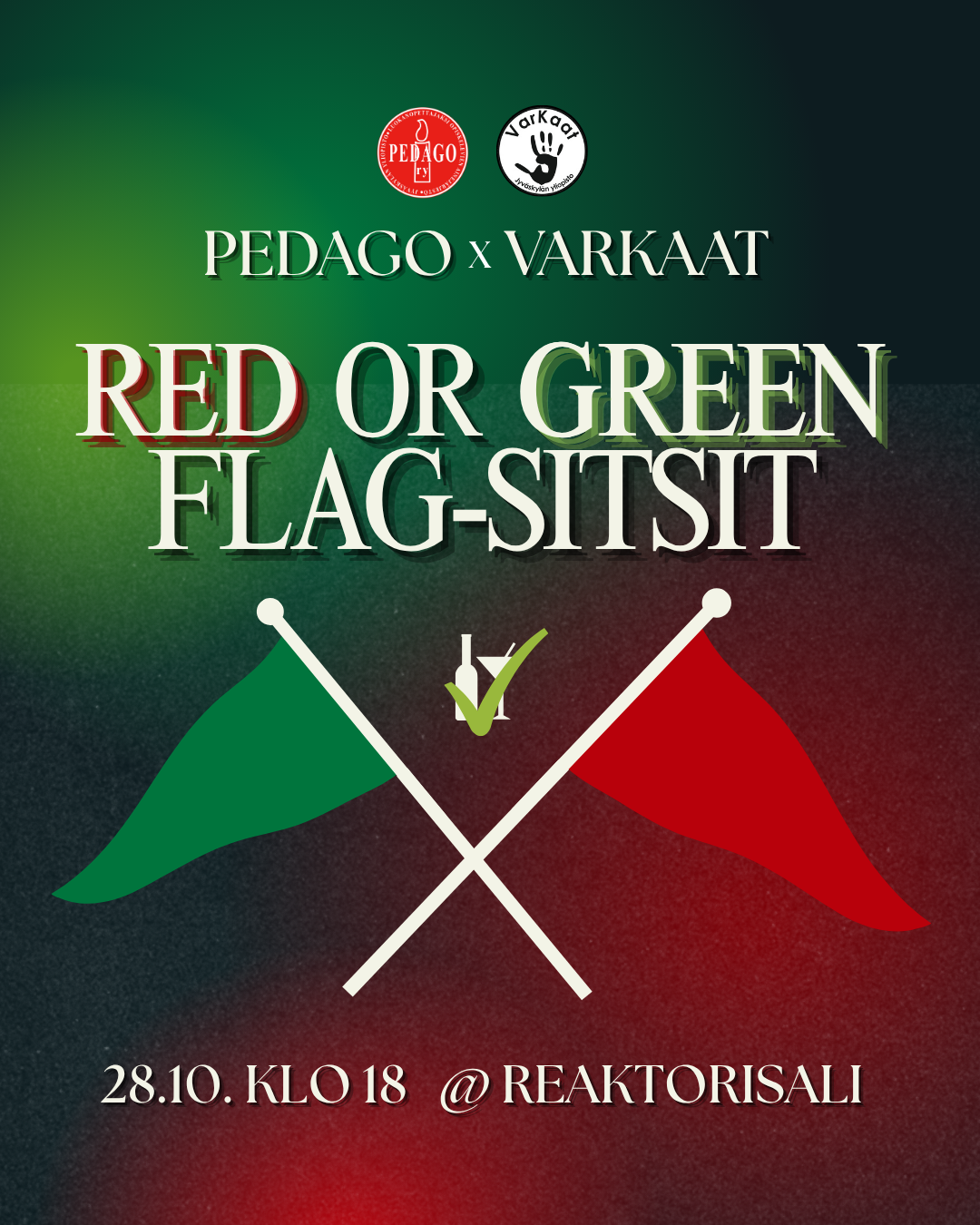 Tämä tapahtuma on vain Varkaiden ja Pedagon jäsenille. Varkaat ja Pedago yhdistävät voimansa sitsien merkeissä 28.10. Reaktorisalissa (Kyllikinkatu 1). Tällä kertaa teemana ovat red flagit ja green…