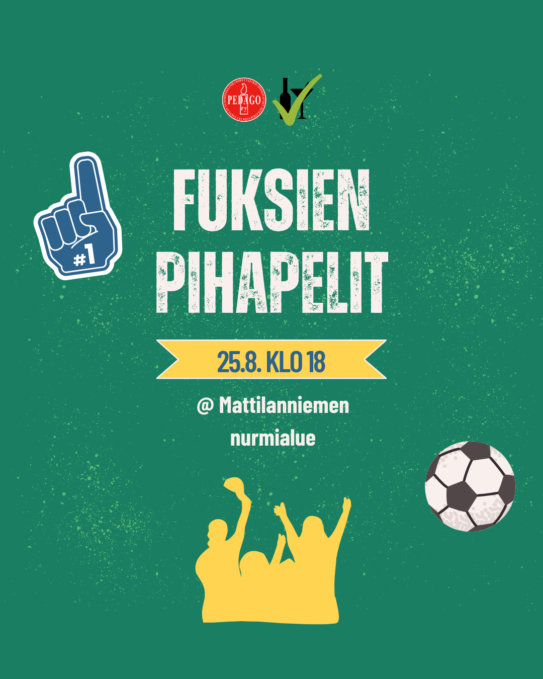 Fuksien pihapelit järjestetään maanantaina 25.8.2025 klo 18 alkaen. Tapahtuma on ilmainen, mutta ilmottauduthan tapahtumaan, jotta osaamme varata tarpeeksi pelejä. Olet tervetullut hengailemaan ja kannustamaan, eikä peleihin tarvitse osallistua. Päälle kannattaa varata sään mukaiset varusteet. Tapahtuma on OPM (=oma pullo mukaan), eli nappaa sinulle mielekästä juotavaa mukaan!